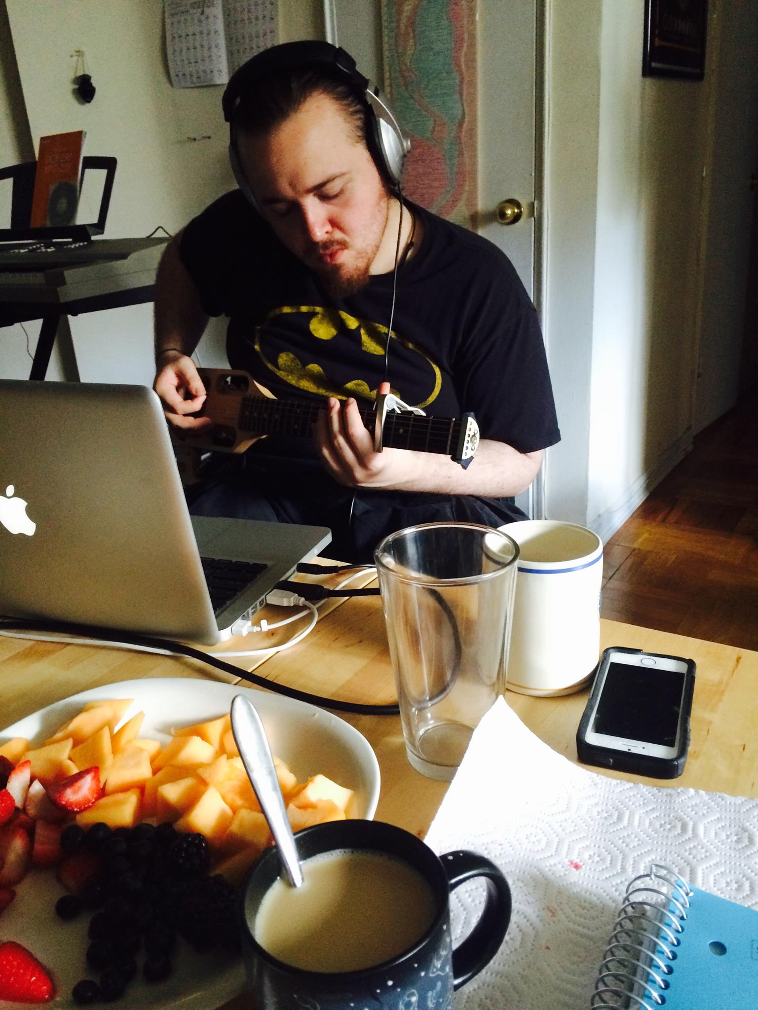 Jeremy arrived on Friday morning at LaGuardia Airport (United). He was supposed to have arrived on Thursday night, but storms over New York had many planes cancelled and rerouted, so he spent the night at his Denver layover, playing his travel guitar with the stethoscope plugged in, so no one could hear him but himself.