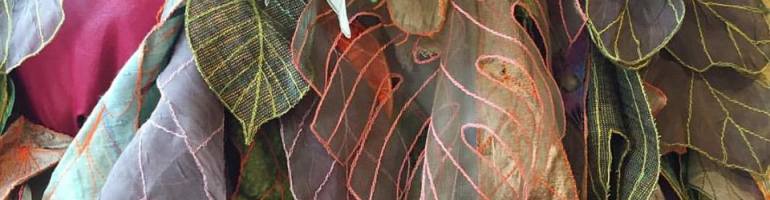 “Perelandra, my large textile art dress is back on display! With a skirt of now 900 free motion embroidered leaves, it is an ever-continuing labor of love.” – Betsie Withey