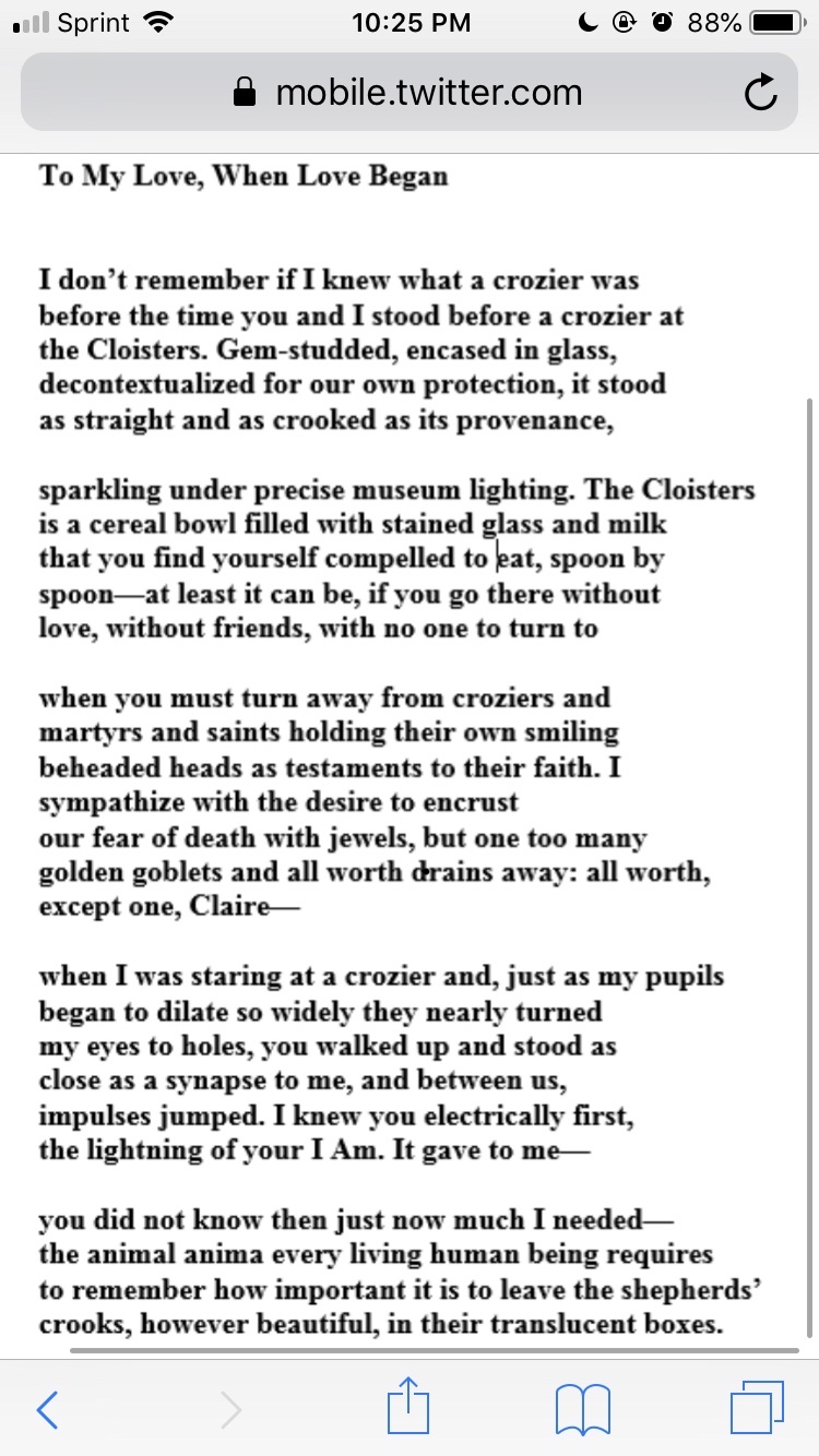 and our judge was jolly, and she laughed for joy, and she said, “By the power vested in me by the State of New York,” and 393 years of history rushed over me, and she was gargantuan, a giantess, and you were as you always have been–the exception to my rule–wearing a plaid shirt and an expression like the first burst of magnolia blooms, and Mir was our witness, and our signatures were sure, and then it was over, cake pops at Starbucks