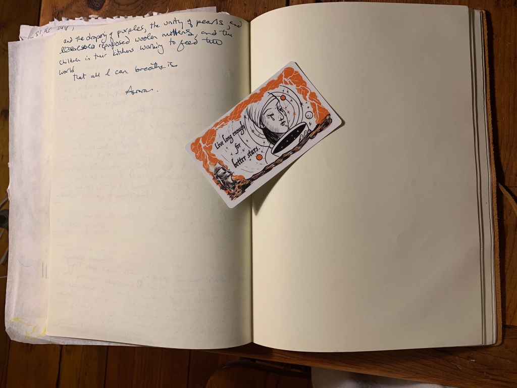 after all this, yes, I have sat me my fine ass in all its rosy sitzfleisch down, in my cotton nightgown, with my clown-stained fingers, with this pen that only sort of works, and awkward chocolate staining my shirt, on this borrowed table, in this borrowed space that we have for a grace of time, where we have dined in solitary splendor and remembered the revelry of silence, remembered that in isolation there is also solace, and I am stuffed so spiffily with the iconography of dawn, with wine-purple pantsuits and repurposed wool mittens, the nacreous unity of ten thousand pearls, earnest children in their kitchens working to feed the world, that all I can breathe, all I can see, all I can sing at the end of all this is