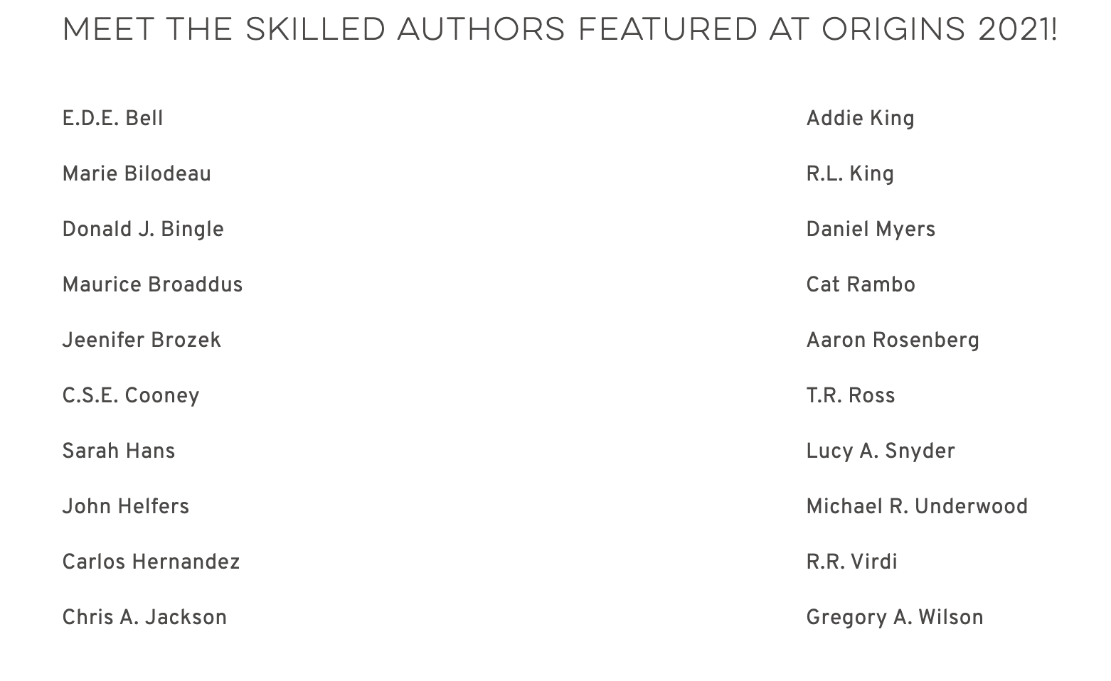 The Origins Library is designed to provide authors the opportunity to interact with their fans, sign autographs, sell books, and lead seminars during the show. Each of them have also participated in the Origins Anthology by contributing a short story to the publication. You can pick up a copy of Anthology from the Origins Store.