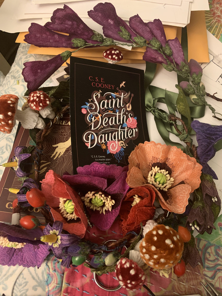 To that end, I then I went to visit her at her studio in Westerly and try on all her flowers and fungus and leaves for the first time. I wanted, I told Betsie, for the poison garden to be the aesthetic of Saint Death’s Daughter.