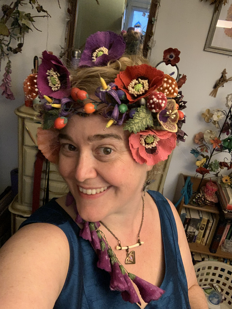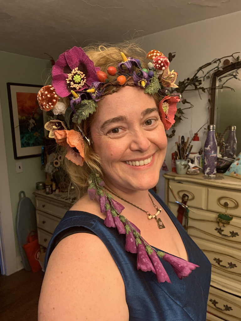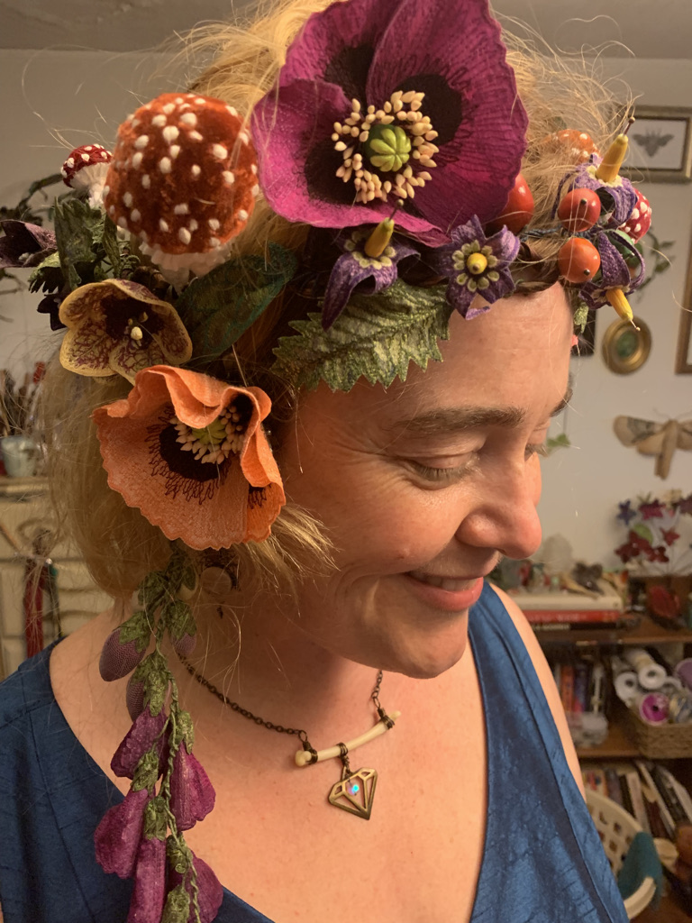 Betsie had to find examples of leaves and flowers out in the wild and deconstruct them, to see how they were put together, so she could recreate them in silk. When she couldn’t find a live plant, she had to order examples online. She drafted flowers and fungus in drawings and practice scraps. She then created the flowers and fungus again in many hues and shades of dupioni silk, hand-dyed velvet, ceramic, wire, felt, and embroidery thread. She repeated the work until it met her standards and satisfied her. She wove a wicker crown on which to structure it all. Some pieces, she decided, would be free-standing, to clip in and around the hair, or wear as an addition band above the wreath. Some pieces would be part of the wreath proper.