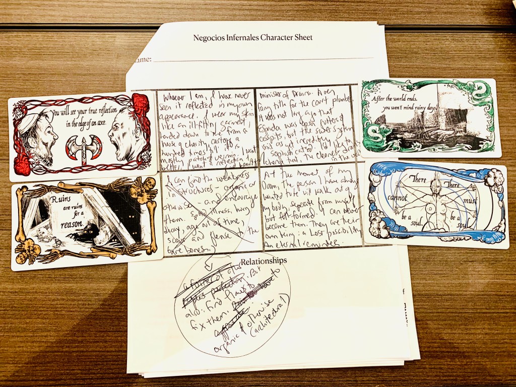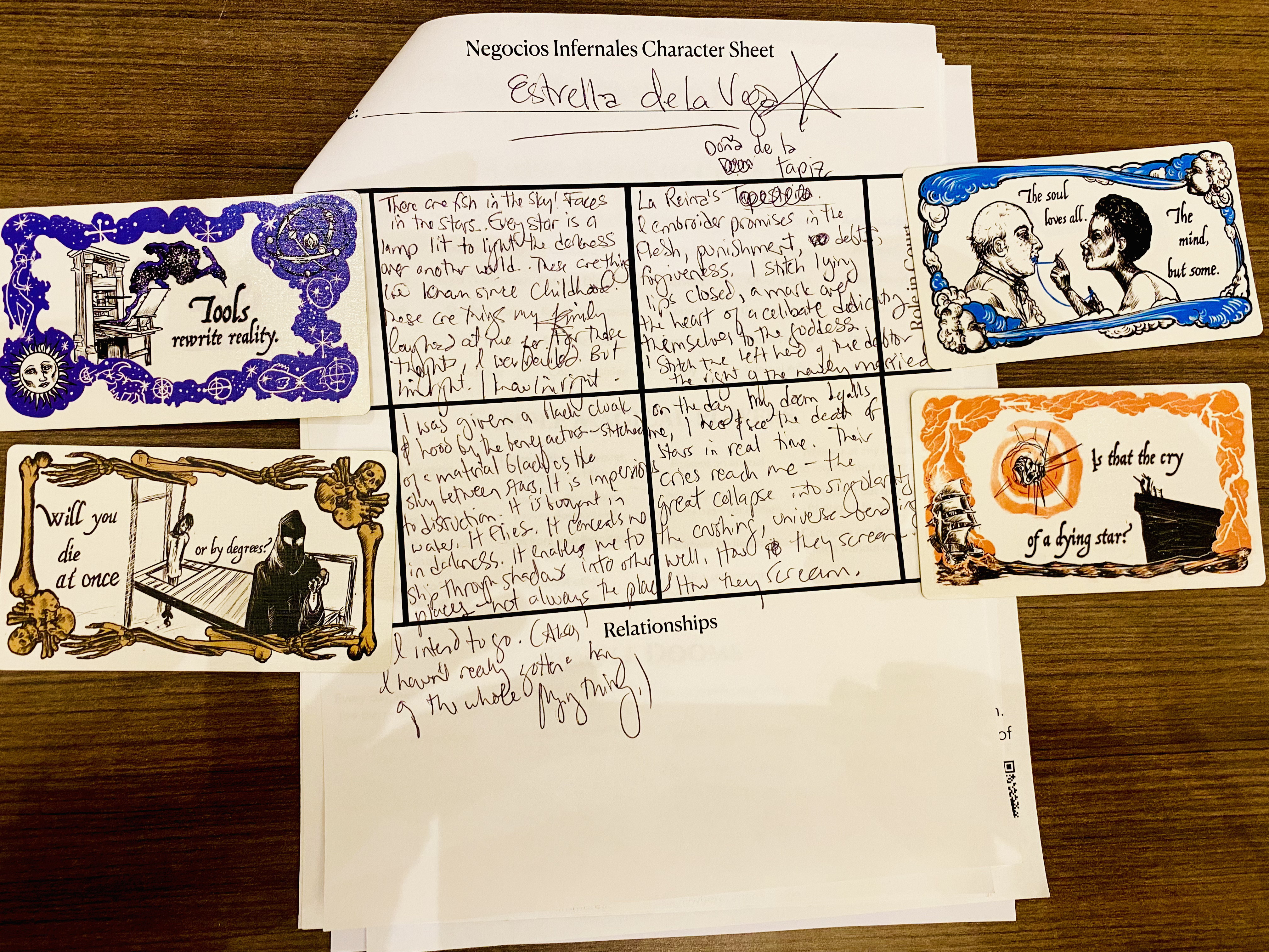 Negocios Infernales is a game where players have perfect information about each other, though the characters may still keep secrets. We can use any part of the card–the suit, the adage, or the image–to inspire our role-playing, or–at this stage–our character creation.