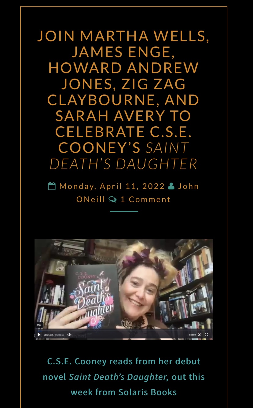 Oh, and while I’m here, may I direct you to a very lovely and celebratory reading that John O’Neill at Black Gate Magazine hosted? It includes SFF writers Martha Wells, James Engle, Sarah Avery, Zig Zag Claybourn, and Howard Andrew Jones–as well as yours truly, C. S. E. Cooney! Watch here!