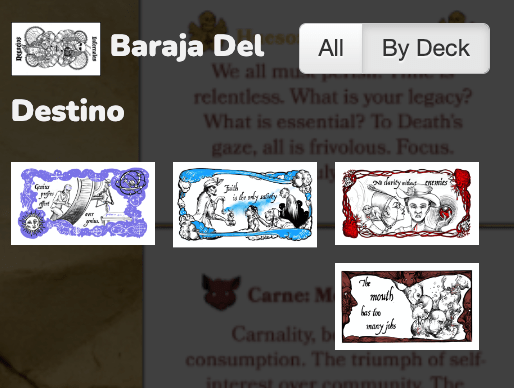 Session 1 of a two-session game of Negocios Infernales usually includes: Part 0: Pregame Trust and Affirmation; Part 1: Invocation; Part 2: Character Creation; Part 3: Relationships; and Part 4: Worldbuilding. This is where all the players collaboratively create their characters, their country, and their world, using the “Baraja del Destino” (the Deck of Destiny). Usually, by the time all this is done, players have a pretty good idea which of the seven plots/genres they’ll want to play.