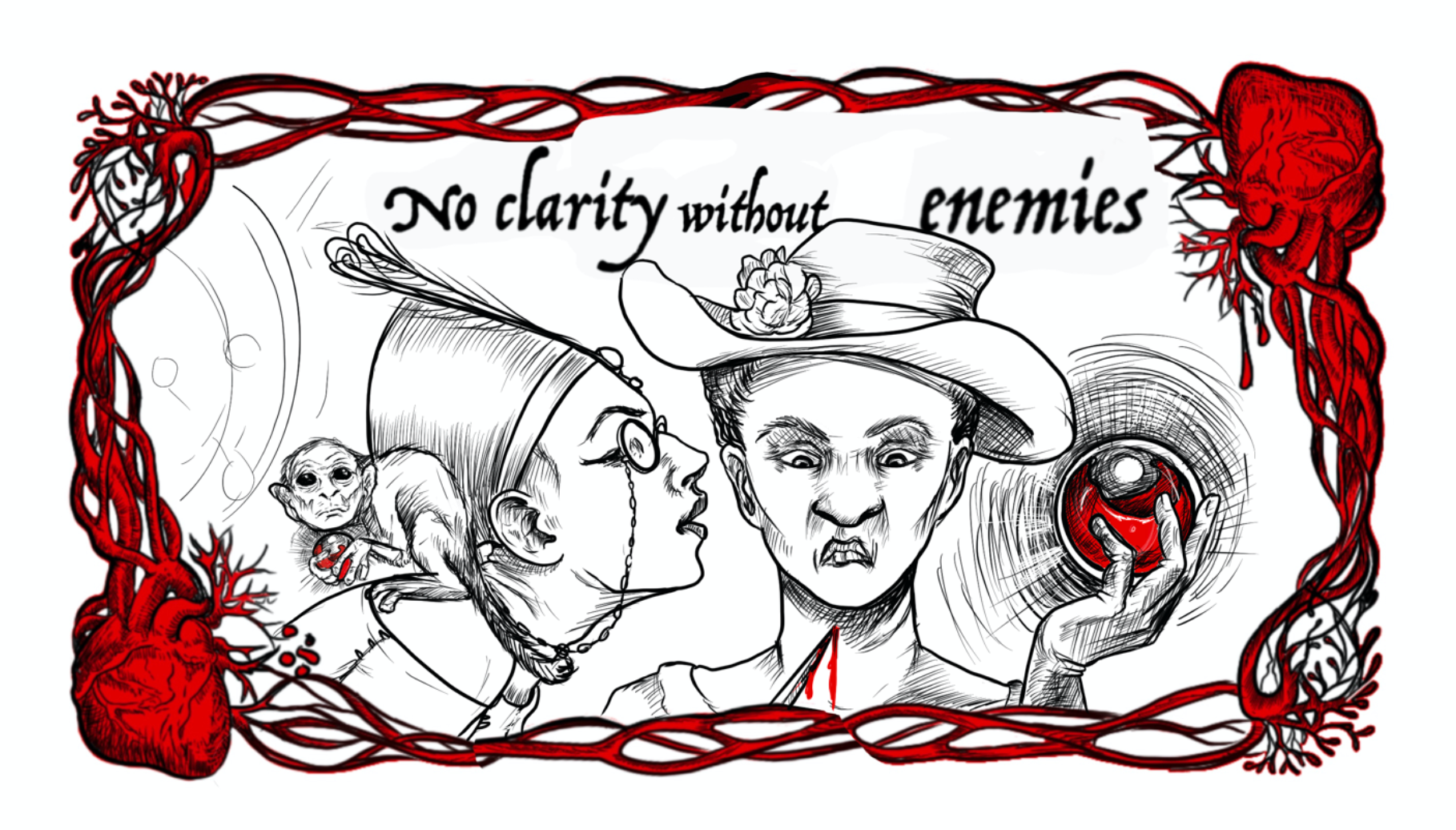In the end, it was almost five hours of harried wizards, demonic monkeys with red glass claws, shapeshifters who have to smell whoever they want to change into, cannibal pearls, alien mollusks, masquerades, cypher-strikers, truth-extractors, and so much more! It was unpredictable and precarious; we were on the verge of losing the game. Our Reina Resoluta token had slid all the way down the Sword. If she’d gotten buried to the hilt, it would have been all over. Thanks to our Doom mechanic (which three of us had to activate to forestall failure), we won by the skin of our teeth. We’d lost most of the rest of our skin.
