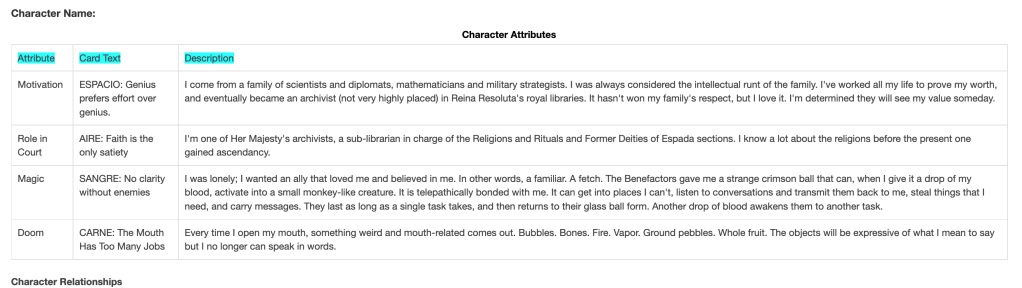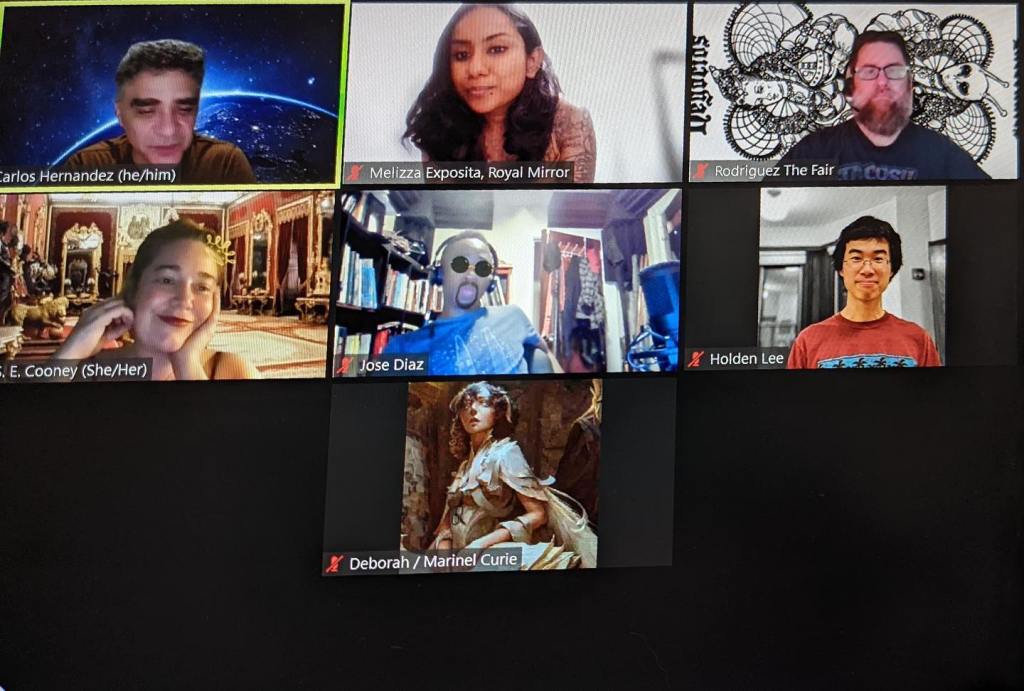 Together, along with “Melliza Exposita, the Royal Mirror” (the queen’s proxy, played by Mimi Mondal), “Jose Díaz, the Cypher Strike” (a thief of books, played by Cam Robb), Rodriguez the Fair (trickster, worldbreaker, spymaster, played by Liam Burke), and our AI/Rulebook Carlos Hernandez, we were well-set up by the end of the first session not only to have a wild night of improv, but maybe also to write, like, 15 novels set in our very weird world.
