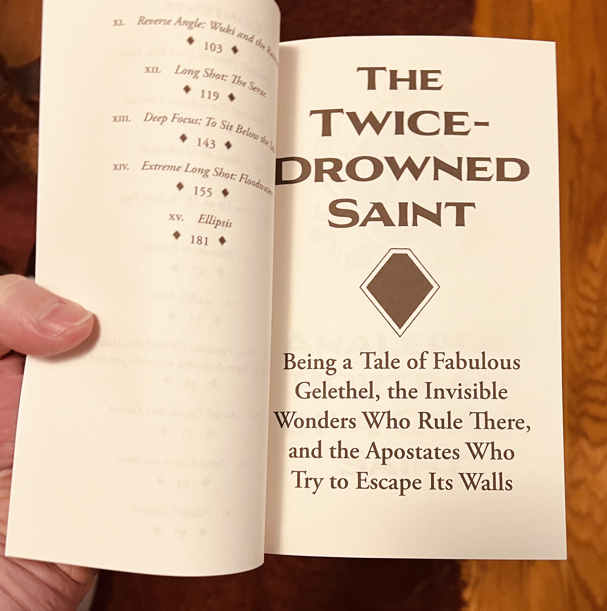 Soon, in Februrary 2023, we are re-releasing The Twice-Drowned Saint: Being a Tale of Fabulous Gelethel, the Invisible Wonders Who Rule There, and the Apostates Who Try to Escape its Walls as a standalone novel–with new fabulous cover and interior art by Lasse Paldanius.