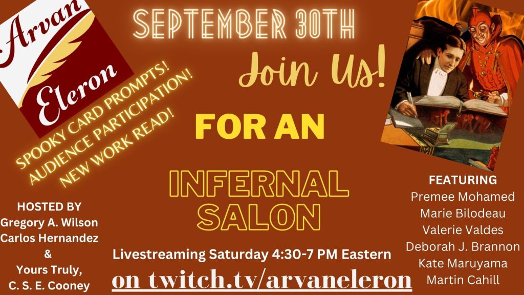 Wilson, Cooney & Hernandez host writers & poets for an Infernal Salon: a literary event to support Arvan Eleron’s sub-a-thon!