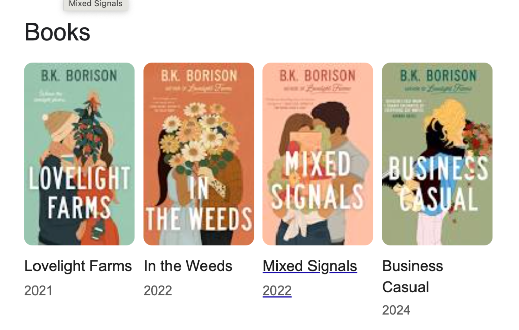Because I subscribe to Penny Reid’s blog, on her recent recommendation I also just flew through the first two books in B. K. Borison’s Lovelight series. Super charmed. Also, they’re fast, so I can FEED MY BRAIN nice things while in frenetic revise-and-edit mode.