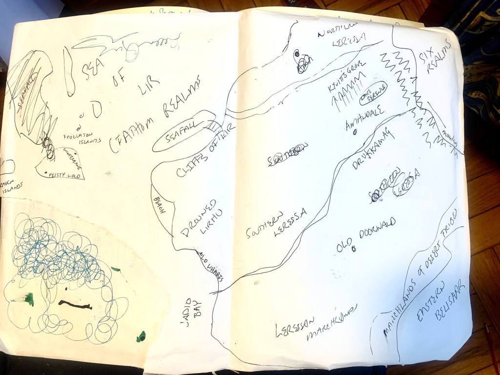Anyway. That’s all. I just wanted to share it with you. It’s funny… looking at them all together like that. These are scraps from ACROSS THE YEARS. I am very haphazard about this sort of thing. And only when someone like Anthony John Woo approaches me about adapting my world for his 5e D&D campaign, or Doc wants me to make me AN ACTUAL MAP do I start considering the notebooks and notebooks full of this stuff.