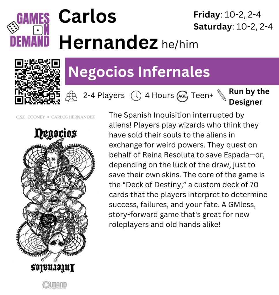 Published by Outland Entertainment, August 2025, NEGOCIOS INFERNALES is a light, GM-less, collaborative TTRPG with no pregame prep. Use a spooky Oracle deck—la Baraja del Destino—to decide your fate and inspire mayhem.