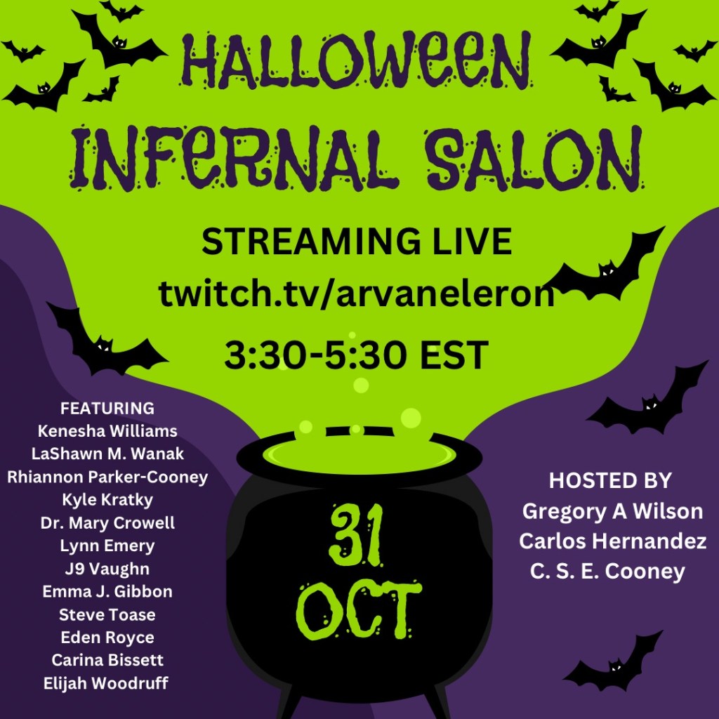 Tomorrow–Halloween!–Carlos, Gregory A. Wilson, and I are hosting one of our INFERNAL SALONS for Halloween.