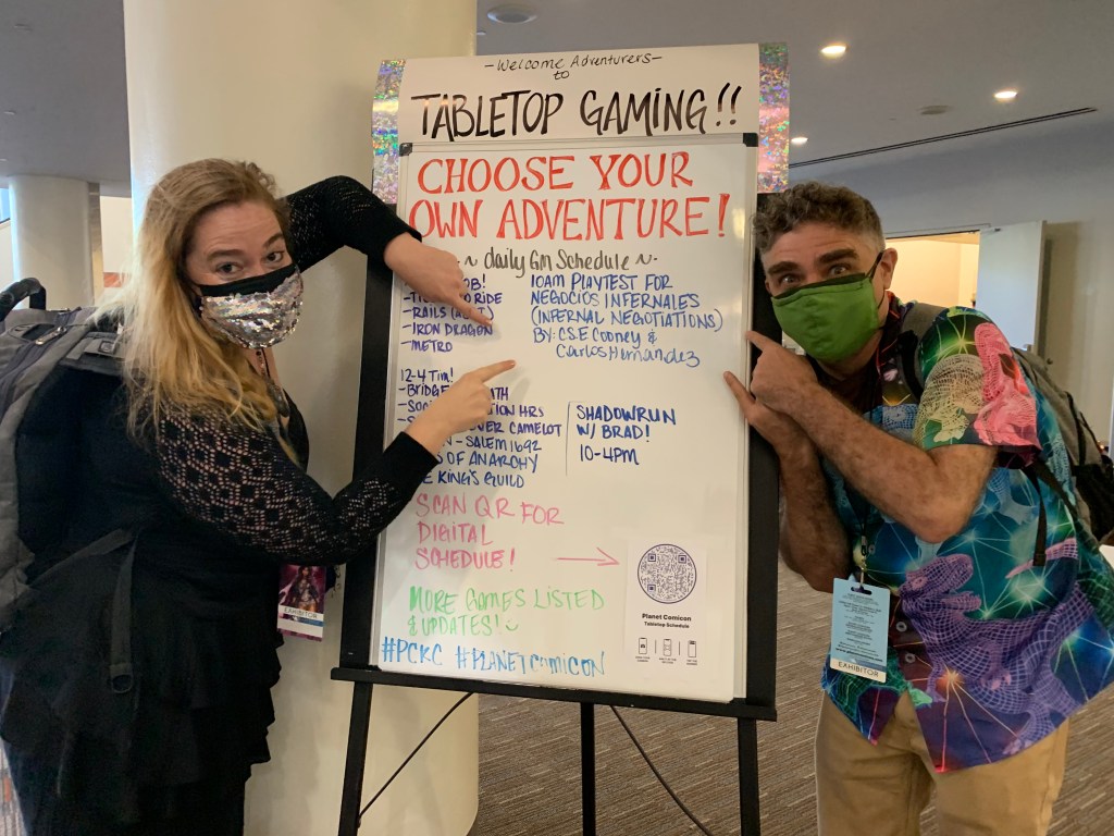 C.S.E. Cooney and Carlos Hernandez demonstrate their GM-less, card-based roleplaying games Negocios Infernales!