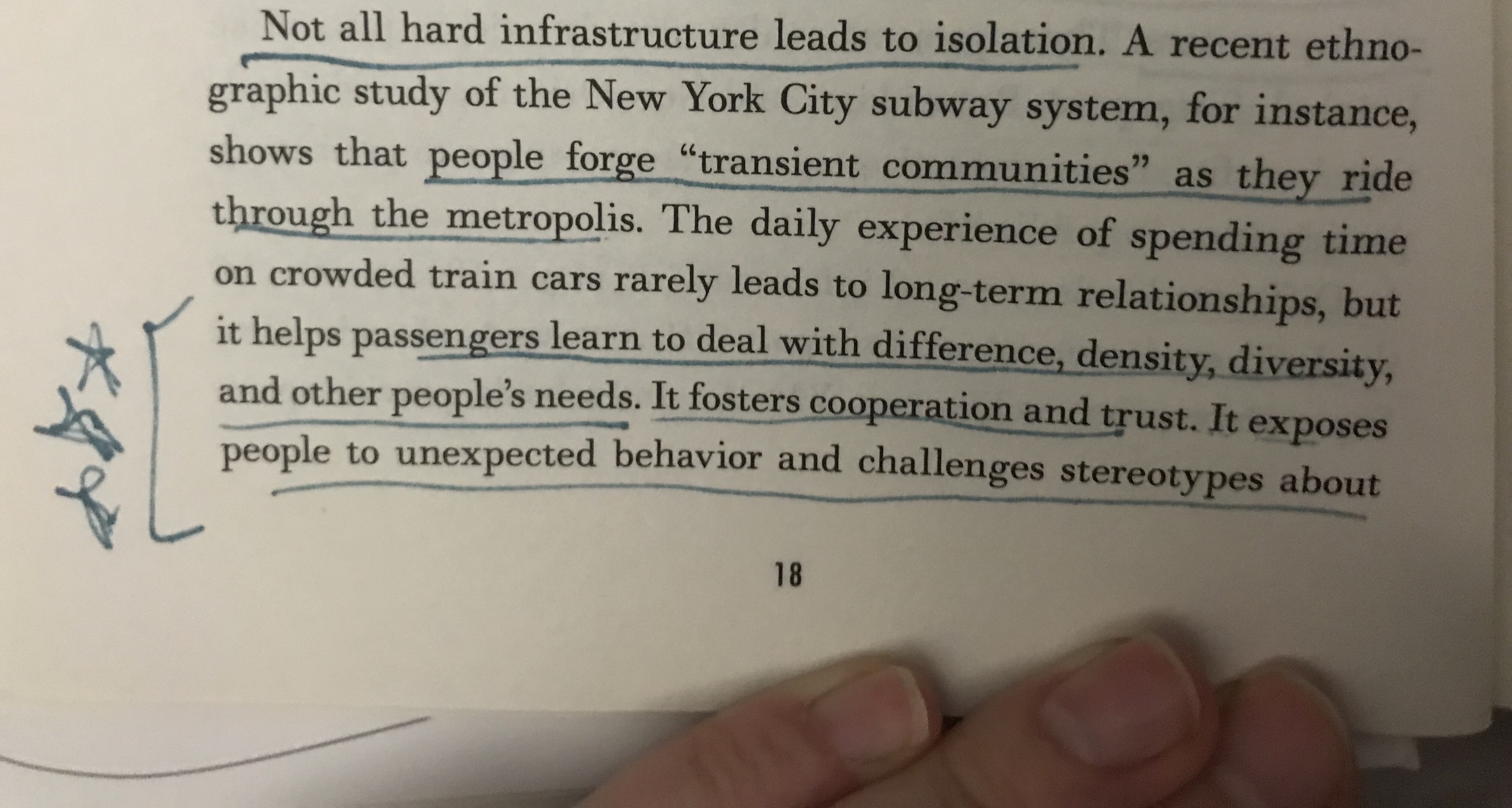 There’s a line in Eric Klinenberg‘s Palaces for the People:How Social Infrastructure Can Help Fight Inequality, Polarization, and the Decline of Civic Life that I recently read that I want to remember here.