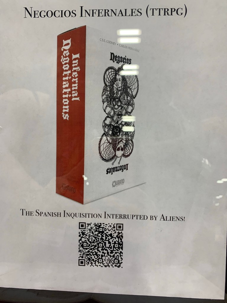 We will also have the prototype of NEGOCIOS INFERNALES to show off, and perhaps a secret sign-up sheet to play a game or two! (Logistics pending!)